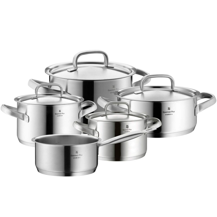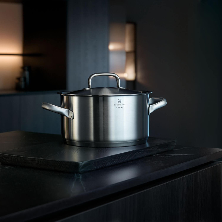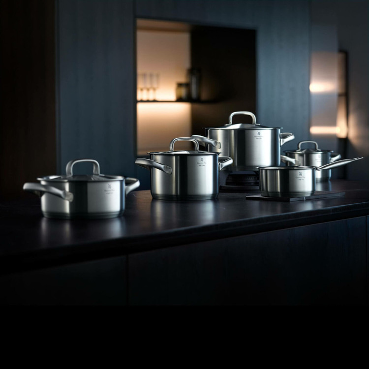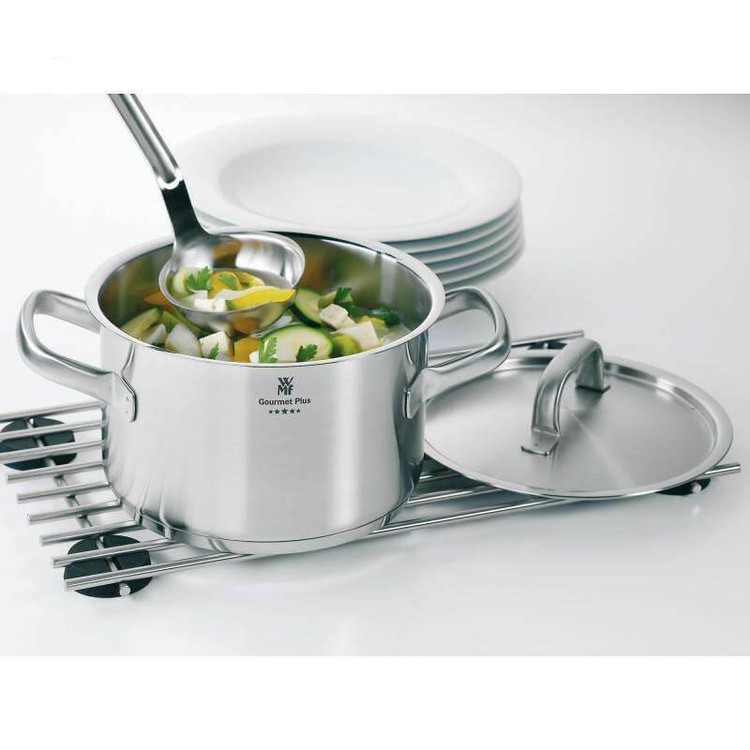 سرویس قابلمه 9 پارچه دبلیو ام اف مدل WMF GOURMET PLUS Vorteils از 9 قطعه ساخته شده که جنس آن از فولاد کرومارگان ضد زنگ است و به لطف درب استیل با کیفیت بالا که تا 250 درجه سانتیگراد در برابر حرارت مقاوم است ، به دلیل درب تمام استیل از خروج بیش از حد بخار جلوگیری و بسیار راحت تمیز می شود . داخل قابلمه ها با درجه بندی مشخص شده آشپزی را راحت تر می کند . کف سه لایه جهانی ثبت شده TransTherm به لطف توزیع و حفظ بهینه گرما ، هنگام پخت و پز در مصرف انرژی صرفه جویی می کند . قابلمه های WMF GOURMET PLUS دارای دسته های توخالی هستند که انتقال حرارت را از قابلمه به دسته کاهش می دهند . قابلمه سایز بزرگ 24 سانتی متر و حجم 5/7 لیتر, قابلمه سایز کوچک 16 سانتی متر و حجم 1/9 لیتر, قابلمه سایز متوسط 20 سانتی متر و حجم 2/5 لیتر, قابلمه سایز متوسط 20 سانتی متر و حجم 3/9 لیتر, شیر جوش 16 سانتی متر و حجم 1.4 لیتر