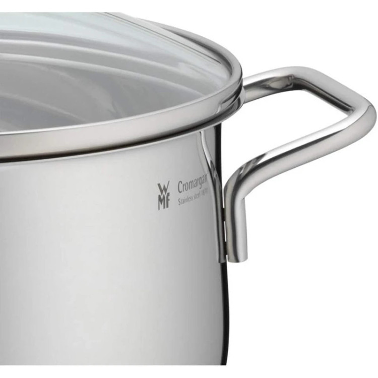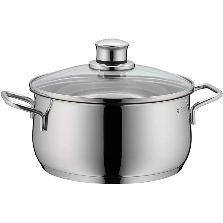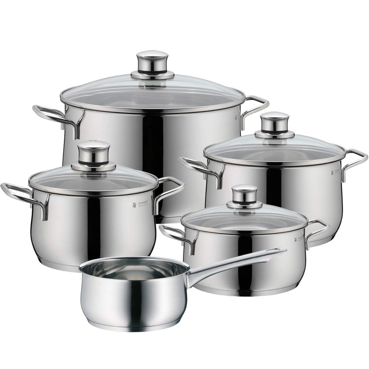 سرویس قابلمه 9 پارچه دبلیو ام اف مدل wmf diadem از 9 قطعه ساخته شده که جنس آن از فولاد کرومارگان ضد زنگ است و جنس درب آن از استیل و شیشه مقاوم در برابر حرارت تا 250 درجه سانتیگراد است . داخل قابلمه ها با درجه بندی مشخص شده که آشپزی را راحت تر می کند . کف سه لایه جهانی ثبت شده TransTherm به لطف توزیع و حفظ بهینه گرما ، هنگام پخت و پز در مصرف انرژی صرفه جویی می کند . این سرویس شامل قابلمه سایز 16 سانت با ظرفیت 1.9 لیتر و سایز 20 کوتاه با ظرفیت 2.5 لیتر و سایز 20 بلند آن با ظرفیت 3.3 لیتر و قابلمه 24 سانت با ظرفیت 5.7 لیتر و شیرجوش سایز 16 سانتی متر آن با ظرفیت 1.7 لیتر میباشد.