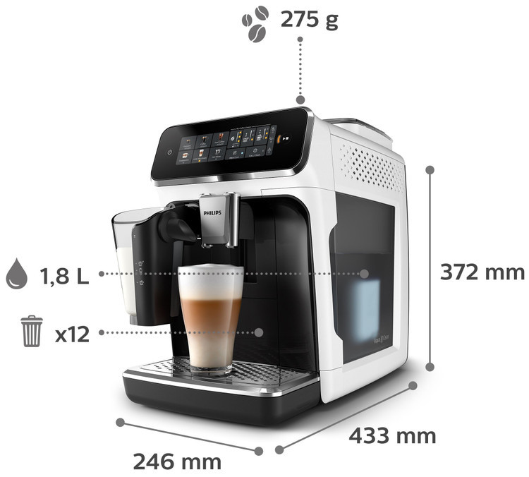 اسپرسو ساز فیلیپس مدل EP3343 تمام اتوماتیک با طراحی فوق العاده شیک و مدرن خود در هر مکانی که قرار بگیرد جلوه گری و نظرها را به سوی خود جلب می کند. مخزن آب اسپرسوساز 1.8 لیتر، مخزن شیر 260 میلی لیتر و ظرف دانه های قهوه 275 گرم می باشد.