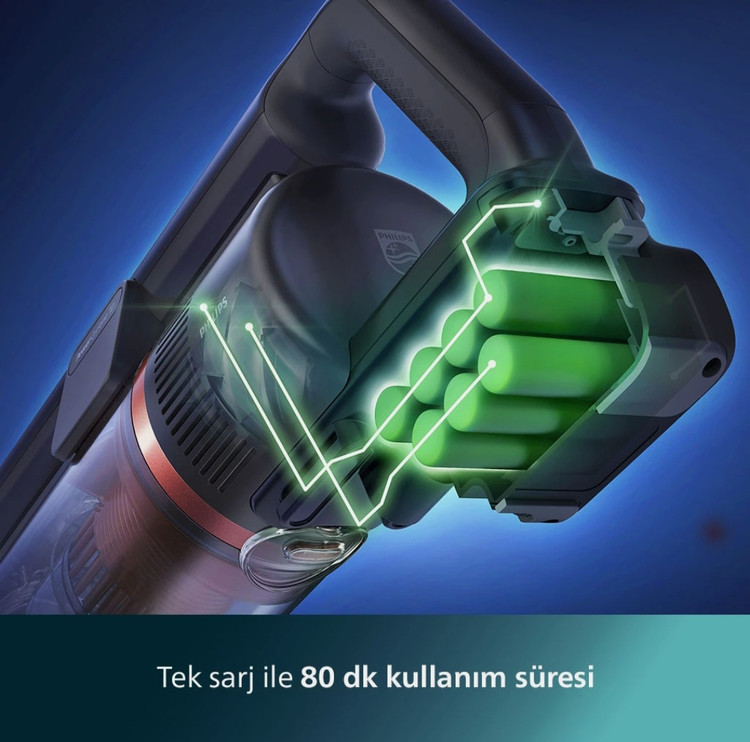 باتری 25.2 ولتی لیتیوم-یونی در حالت اکو تا 80 دقیقه و در حالت توربو تا 30 دقیقه کارکرد دارد، بهطوریکه با یکبار شارژ، کل خانه را تمیز کنید