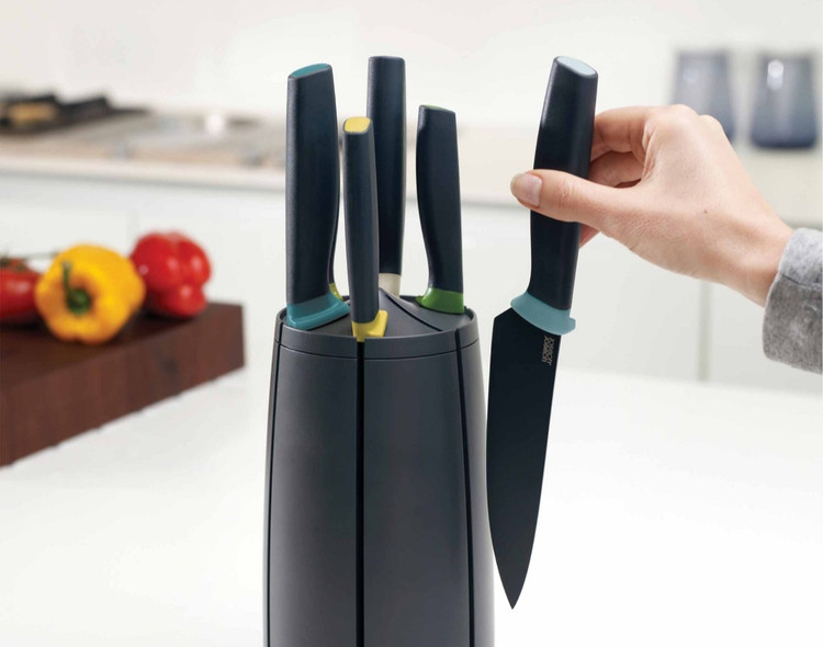 ست چاقوی ۶ پارچه Joseph Joseph Elevate Carousel یک انتخاب ایدهآل برای آشپزخانههای مدرن است. این ست شامل شش چاقوی حرفهای با کیفیت بالا و یک پایه چرخان ۳۶۰ درجه است که دسترسی به هر چاقو را سریع و آسان میکند. طراحی ارگونومیک دستهها باعث راحتی در استفاده و کاهش فشار بر مچ دست میشود. همچنین، تیغهها از استیل ضدزنگ با دوام بالا ساخته شدهاند و برای برشهای دقیق و آسان طراحی شدهاند.