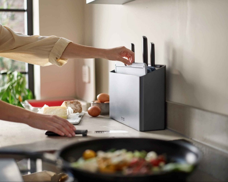 ست حرفهای Joseph Joseph Folio Plus ترکیبی بینظیر از طراحی مدرن، کیفیت برتر و کاربردی بودن است. این مجموعه شامل ۴ عدد تخته برش کدبندی شده به همراه ۴ عدد چاقوی آشپزخانه با تیغه استیل ضدزنگ و دستههای ارگونومیک است. تختهها بهصورت کد رنگی طراحی شدهاند تا برای انواع مواد غذایی (گوشت قرمز، مرغ، ماهی، سبزیجات) استفاده شوند و از انتقال آلودگی جلوگیری کنند. پایه نگهدارنده، هر دو بخش چاقو و تختهها را بهصورت منظم و بهداشتی در یکجا نگه میدارد.