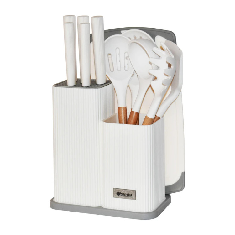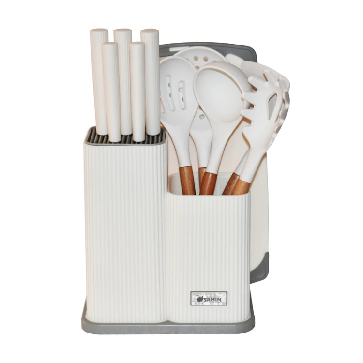 | سایر توضیحات | سرویس چاقو و کفگیر و ملاقه 12 پارچه شاهین - مدل : SHN 1031 - متشکل از 5 پارچه کفگیر و ملاقه و 5 پارچه سرویس چاقو و استند و تخته گوشت - ابعاد کفگیر و ملاقه : 32cm-32cm-32cm 32cm-33cm - ابعاد سرویس چاقو : 33cm - 33cm - 33cm - 24cm - 19cm - جنس کفگیر و ملاقه : سیلیکون و دسته چوبی - جنس چاقو : فولاد ضد زنگ - ابعاد استند : 22x13x24 سانتی متر - ابعاد تخته : 32.8x20x0.6 - قابل شستشو در ماشین ظرفشویی - طراحی ارگونومیک - چاقو بسیار تیز و برنده |