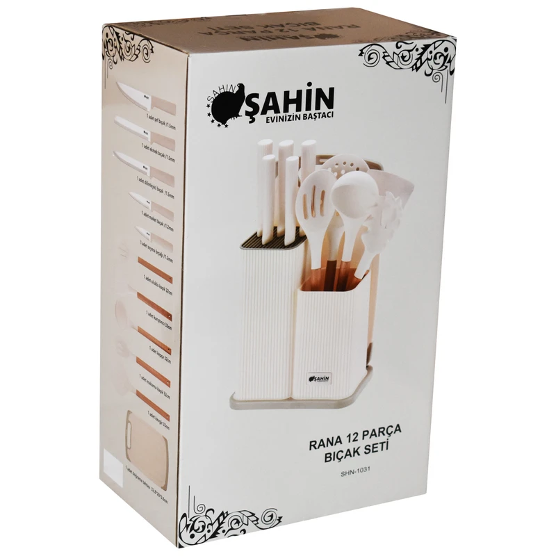 | سایر توضیحات | سرویس چاقو و کفگیر و ملاقه 12 پارچه شاهین - مدل : SHN 1031 - متشکل از 5 پارچه کفگیر و ملاقه و 5 پارچه سرویس چاقو و استند و تخته گوشت - ابعاد کفگیر و ملاقه : 32cm-32cm-32cm 32cm-33cm - ابعاد سرویس چاقو : 33cm - 33cm - 33cm - 24cm - 19cm - جنس کفگیر و ملاقه : سیلیکون و دسته چوبی - جنس چاقو : فولاد ضد زنگ - ابعاد استند : 22x13x24 سانتی متر - ابعاد تخته : 32.8x20x0.6 - قابل شستشو در ماشین ظرفشویی - طراحی ارگونومیک - چاقو بسیار تیز و برنده |