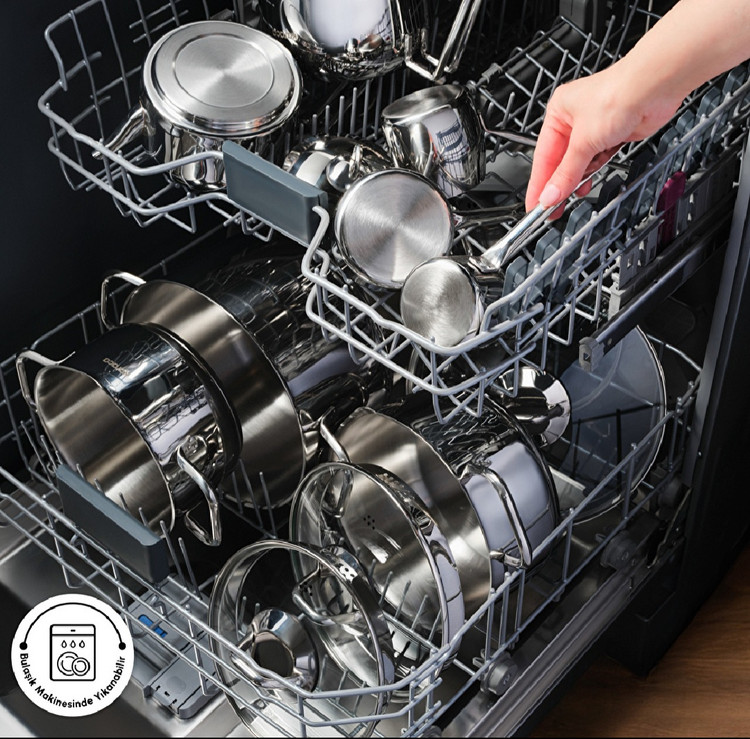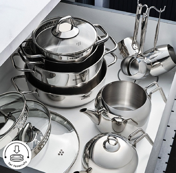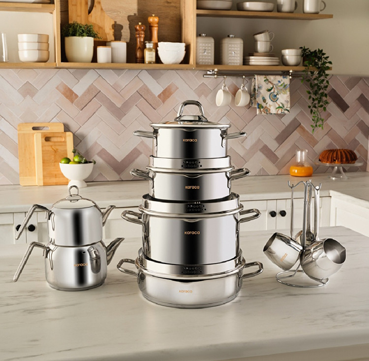 سرویس Karaca Vapor با طراحی کاملاً استیل و براق، یک ست کامل برای آشپزخانههای مدرن است.