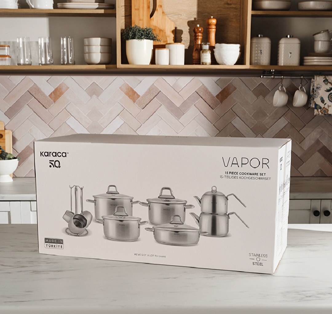 سرویس Karaca Vapor با طراحی کاملاً استیل و براق، یک ست کامل برای آشپزخانههای مدرن است.