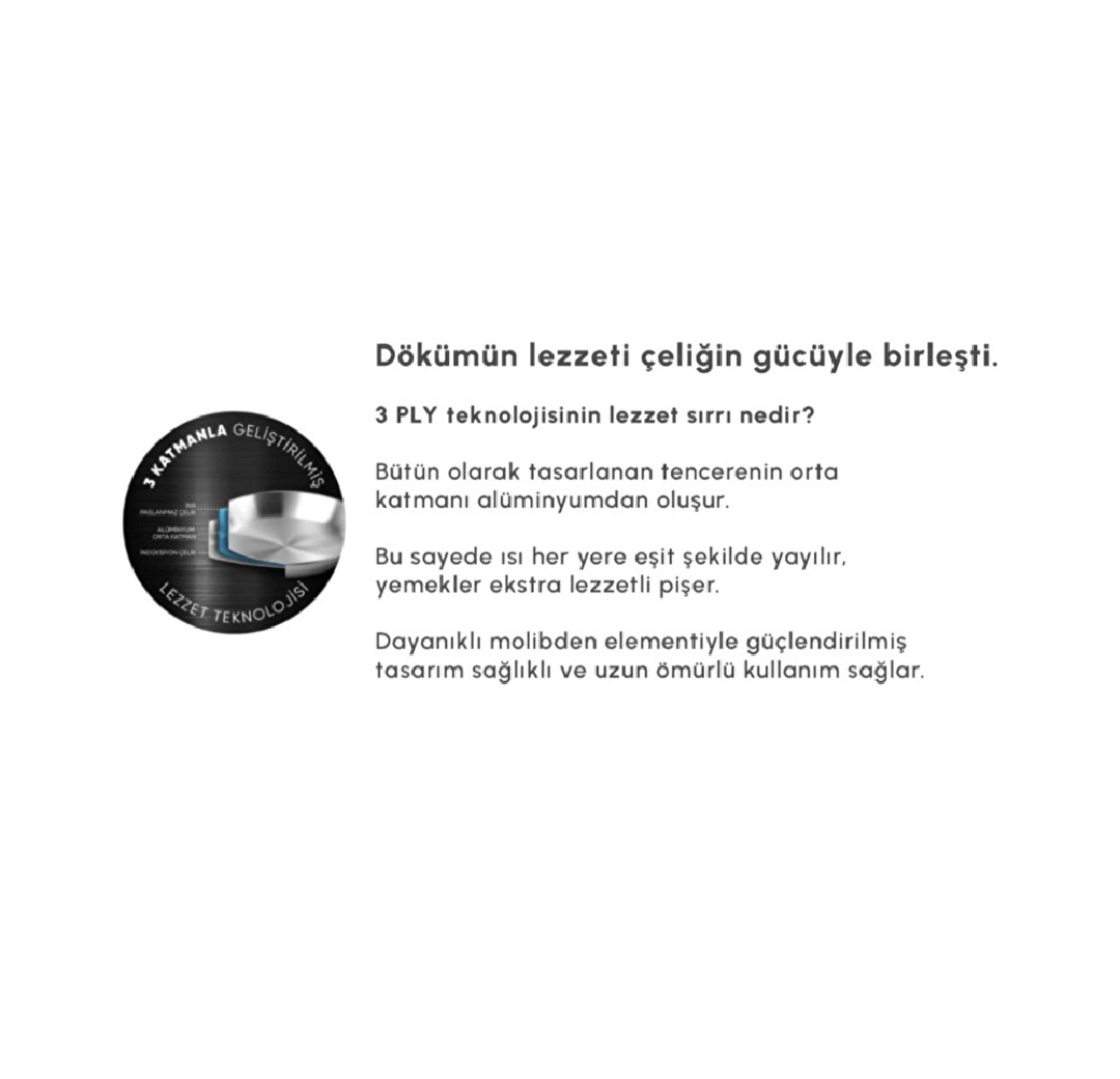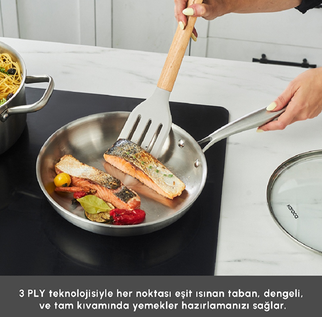 ساختار سهلایه (3Ply) باعث انتقال سریع و یکنواخت حرارت در کف و دیوارهها میشود، در نتیجه غذا یکنواختتر میپزد و مصرف انرژی کاهش مییابد.