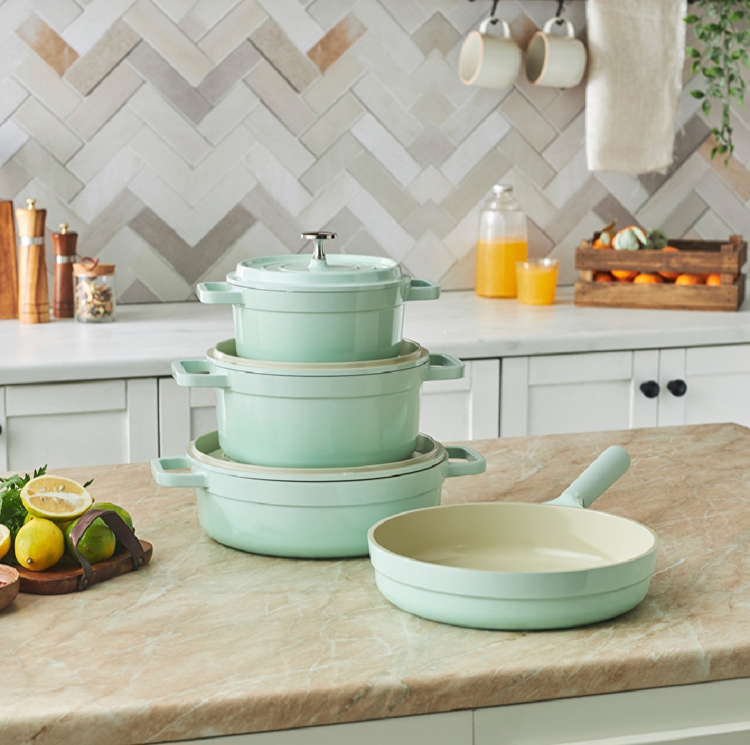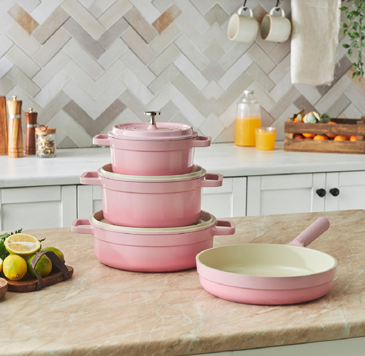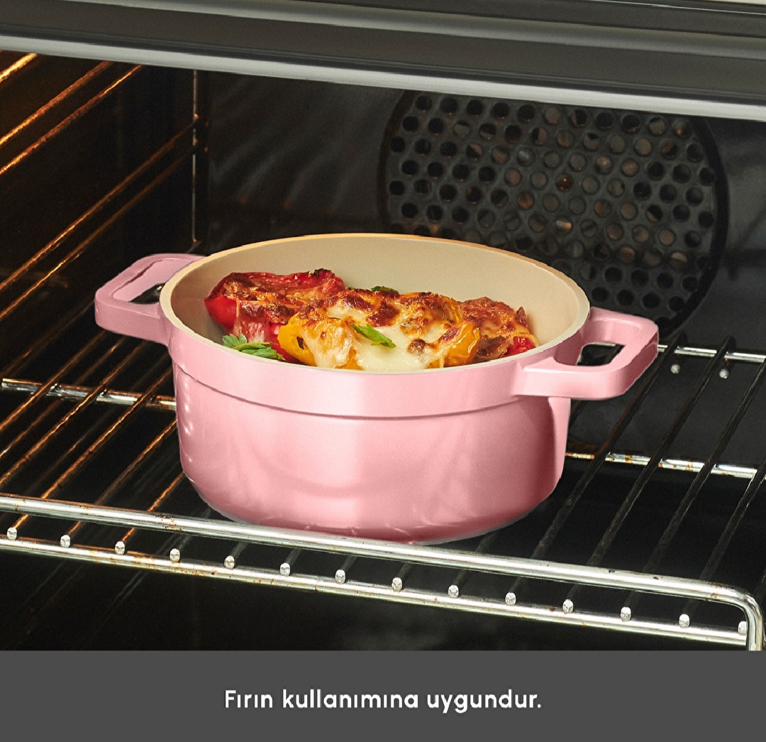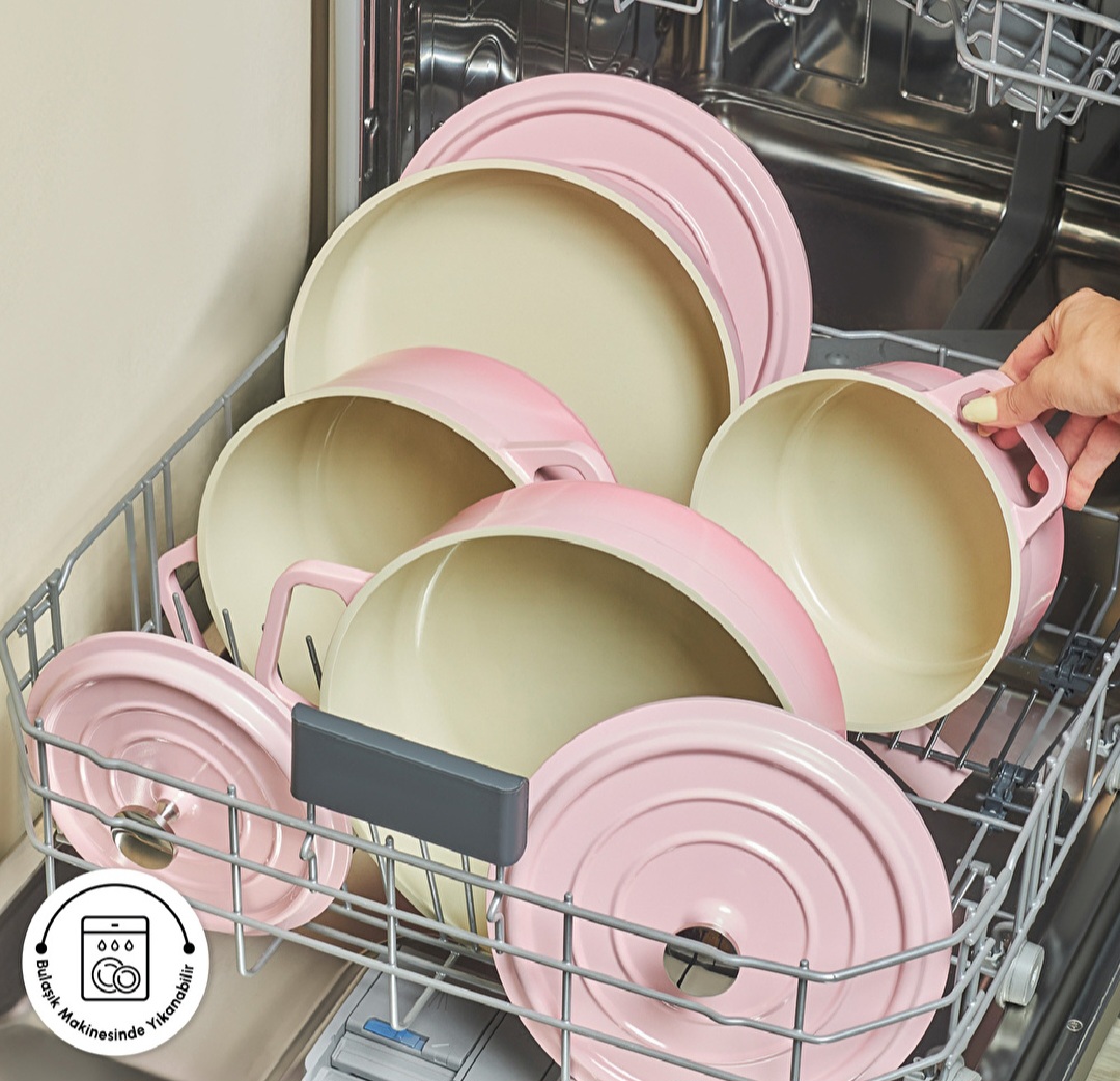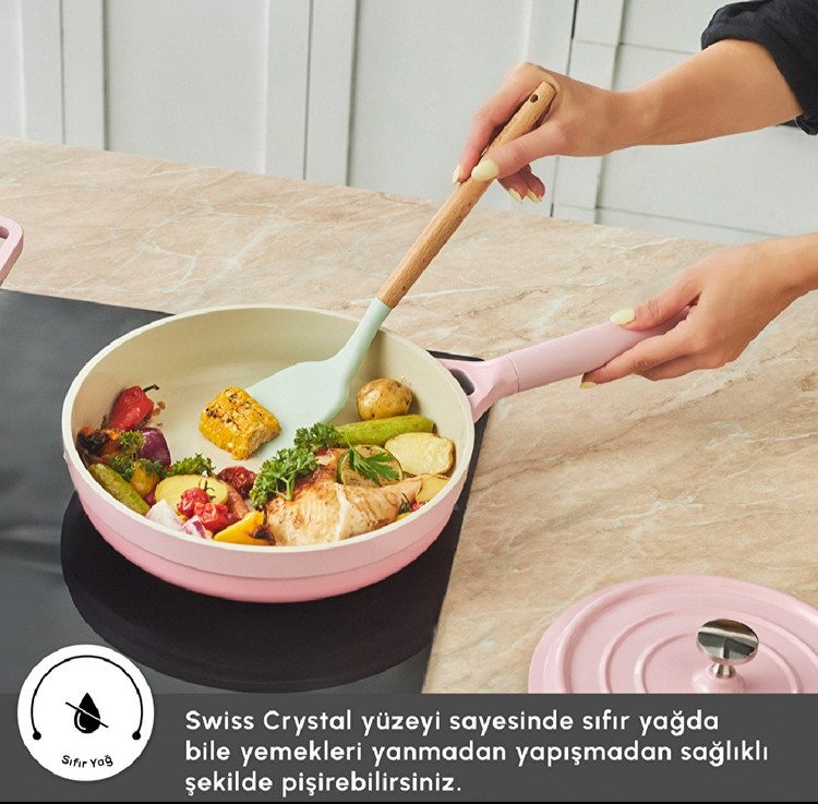 این سرویس از چدن (دایکست) ساخته شده که باعث پخش یکنواخت حرارت و حفظ گرما میشود. پوشش داخلی سرامیکی Swiss Crystal خاصیت نچسب دارد و امکان پخت غذا با روغن کم یا بدون روغن را فراهم میکند.