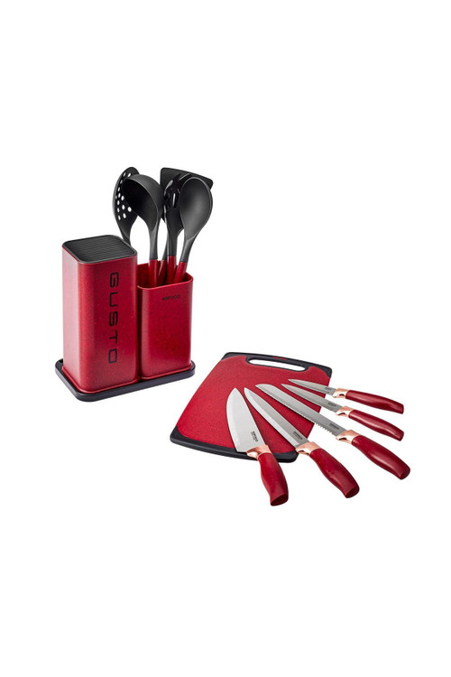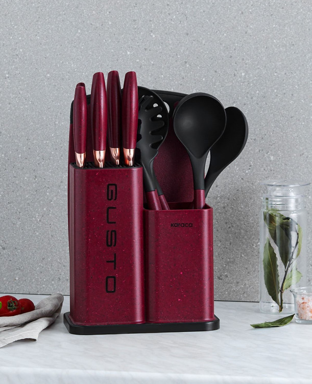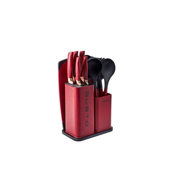 ست چاقوی گوستو هم بسیارشیک و هم بسیار کاربردی است. این ست شامل انواع کاردها و قاشق اندازه گیری،کفگیر،ملاقه،قاشق ماکارونی میباشد. با وجود چنین سرویسی در آشپزخانه دیگر نیازی به چاقوها و انواع کفگیرهای تکی نمیباشد.جنس این ست از استیل ضد زنگ است. تمامی این سرویس در یک استند نگهدارنده جا میگیرد.سرویس چاقوی گوستو دارای یک تخته برش مناسب هم است.با داشتن این سرویس کارهای آشپزخانه سریعتر انجام میشود. این سرویس دارای رنگ قرمز بسیار زیبا،است.همچنین پیشنهاد میشوددوستان نوعروس برای خرید ست چاقوی آشپزخانه این سرویس را امتحان کنند.پس از شستشو بهتر است که با دستمال خشک شود