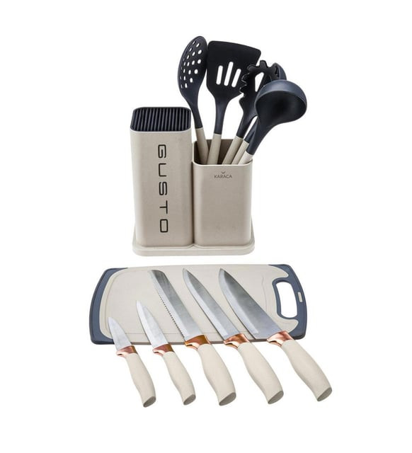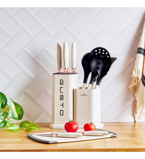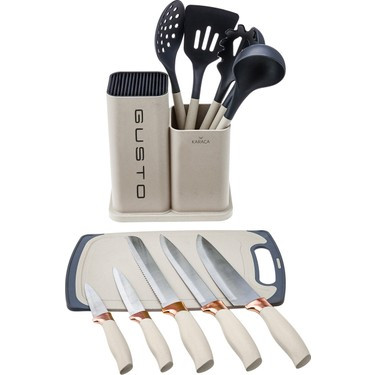 ست چاقوی گوستو هم بسیارشیک و هم بسیار کاربردی است. این ست شامل انواع کاردها و قاشق اندازه گیری،کفگیر،ملاقه،قاشق ماکارونی میباشد. با وجود چنین سرویسی در آشپزخانه دیگر نیازی به چاقوها و انواع کفگیرهای تکی نمیباشد.جنس این ست از استیل ضد زنگ است. تمامی این سرویس در یک استند نگهدارنده جا میگیرد.سرویس چاقوی گوستو دارای یک تخته برش مناسب هم است.با داشتن این سرویس کارهای آشپزخانه سریعتر انجام میشود. این سرویس دارای رنگ قرمز بسیار زیبا،است.همچنین پیشنهاد میشوددوستان نوعروس برای خرید ست چاقوی آشپزخانه این سرویس را امتحان کنند.پس از شستشو بهتر است که با دستمال خشک شود