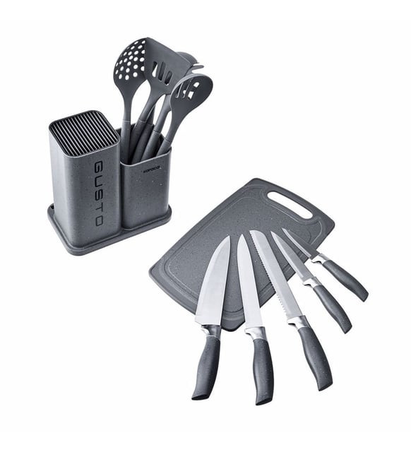 ست چاقوی گوستو هم بسیارشیک و هم بسیار کاربردی است. این ست شامل انواع کاردها و قاشق اندازه گیری،کفگیر،ملاقه،قاشق ماکارونی میباشد. با وجود چنین سرویسی در آشپزخانه دیگر نیازی به چاقوها و انواع کفگیرهای تکی نمیباشد.جنس این ست از استیل ضد زنگ است. تمامی این سرویس در یک استند نگهدارنده جا میگیرد.سرویس چاقوی گوستو دارای یک تخته برش مناسب هم است.با داشتن این سرویس کارهای آشپزخانه سریعتر انجام میشود. این سرویس دارای رنگ قرمز بسیار زیبا،است.همچنین پیشنهاد میشوددوستان نوعروس برای خرید ست چاقوی آشپزخانه این سرویس را امتحان کنند.پس از شستشو بهتر است که با دستمال خشک شود